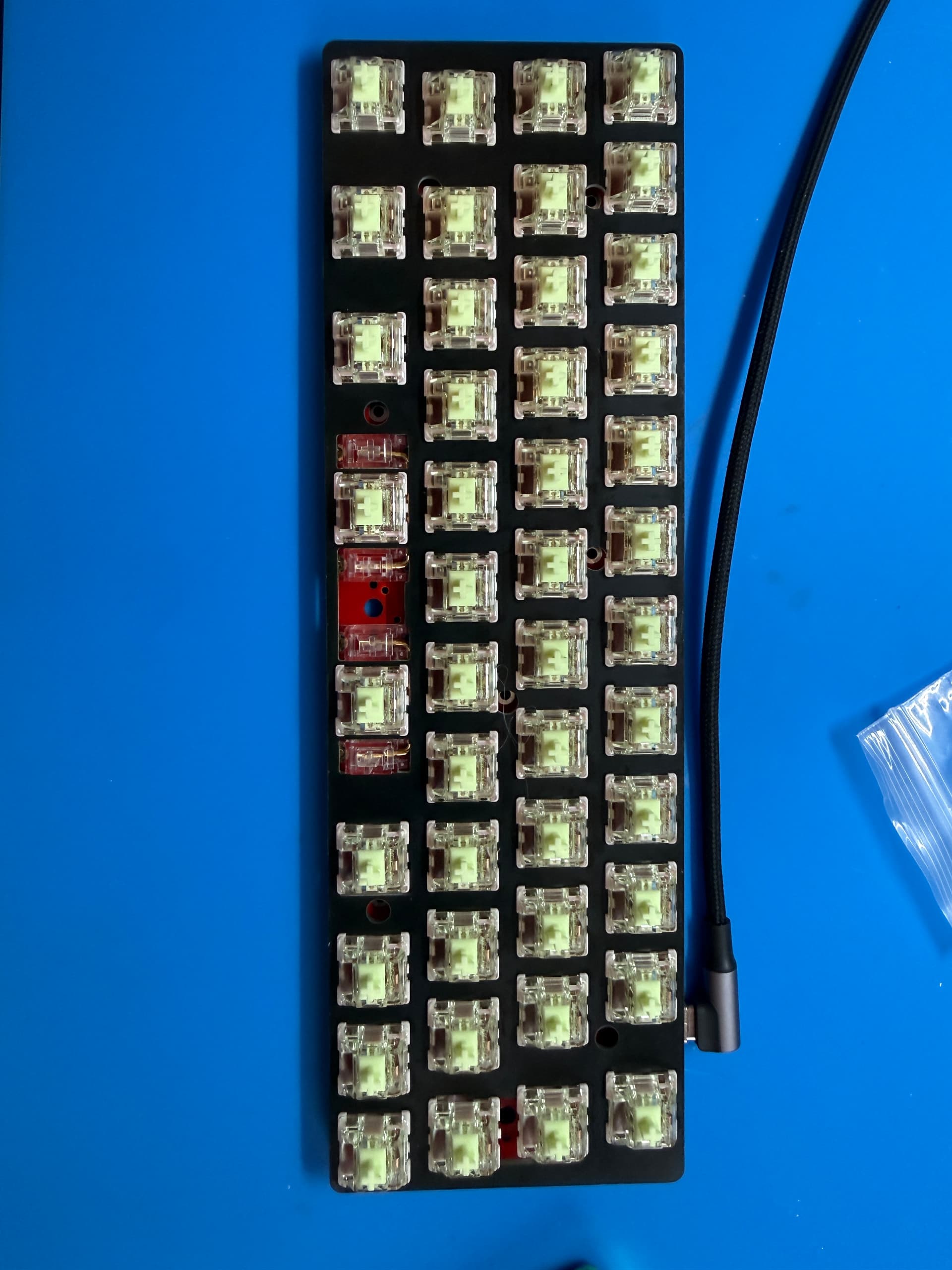 I also swapped out the Gateron X switches; they had a period-correct spring ring, but I didn’t like it. I replaced them with MZ Z1 budget linears and they actually slap; I tested a bunch of switches and liked them the best! Sound test at some point.