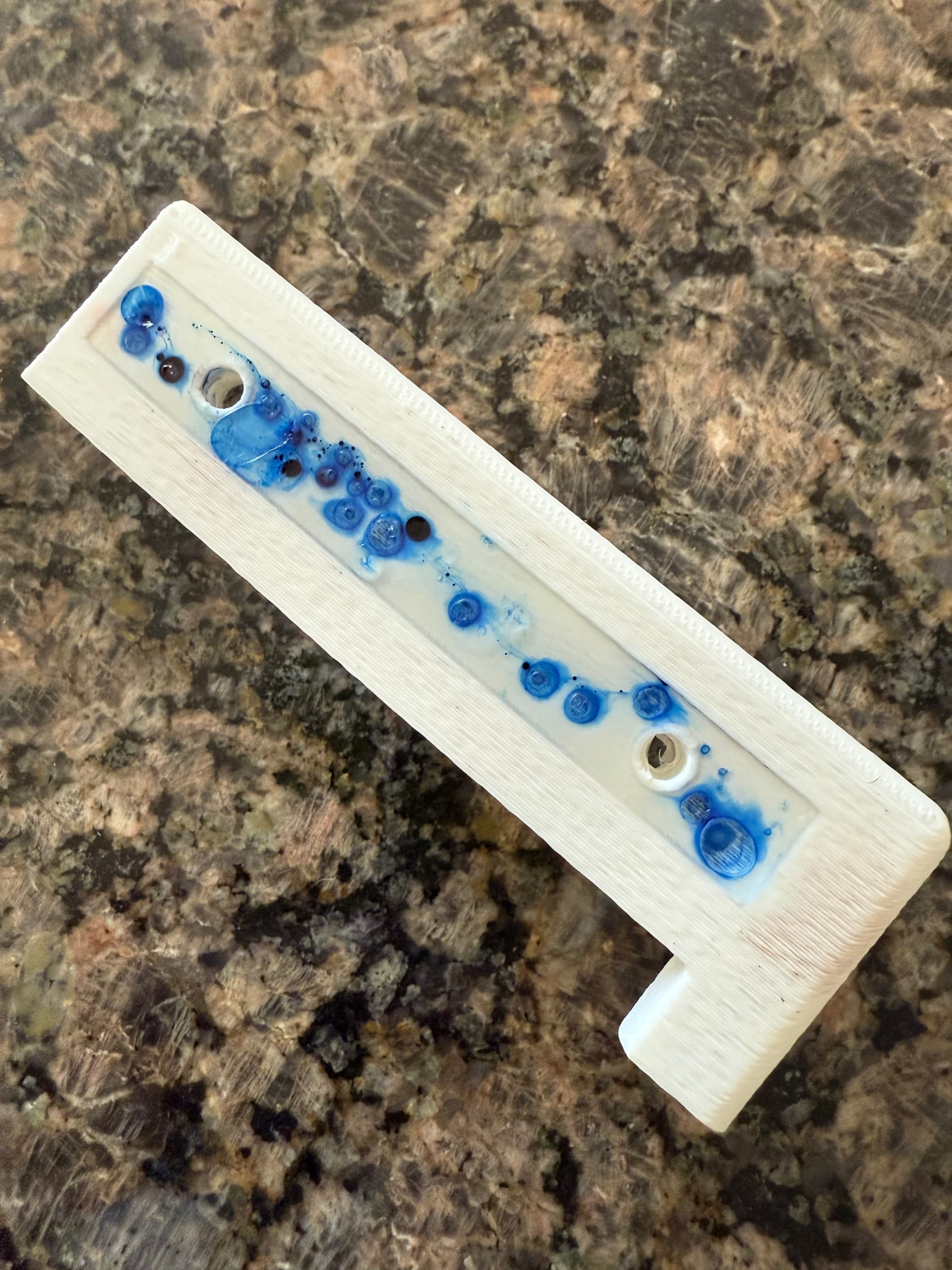 I threw some UV resin into the test print’s recess and just dripped some fountain pen ink onto the top. The tint obviously cannot be done that way (and in my defense, I will insist that I was just messing around with that part), but the resin itself cured pretty nicely and very quickly out in the sun. I think pre-blending or laying down a base before the resin, and properly masking of course, is promising. One tangential note: the ink is brown, and when I touched a bubble that didn’t have enough resin to cure, it was still brown, but the interaction with the resin makes it look pretty darn blue. Physics is cool.