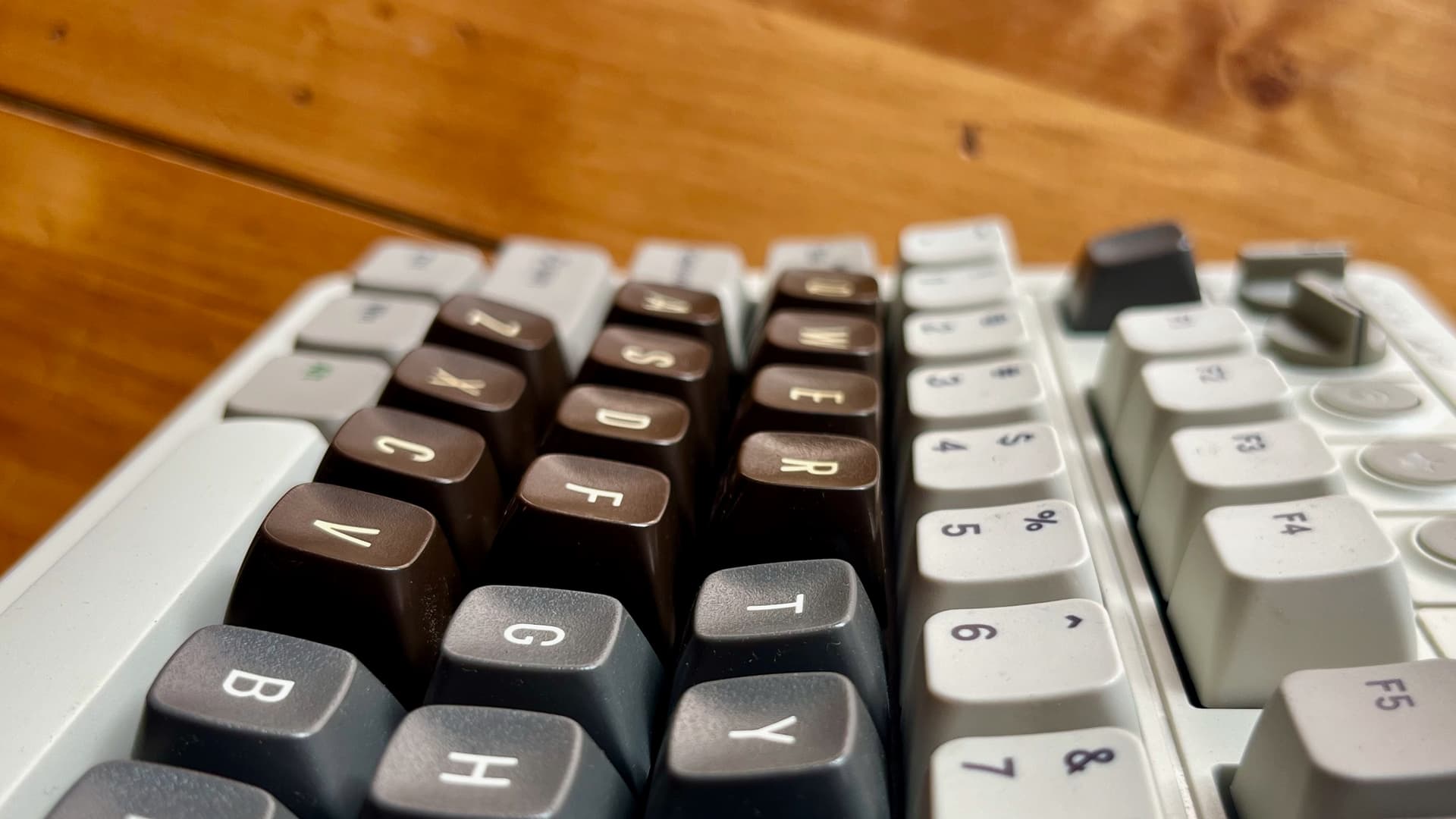 The 1.5u keys I’m most eager to be able to use are the f-keys, since they’re a lovely mocha color. Which reminds me: I’ve been calling these C64 keycaps, but they’re actually from a VIC-20, an earlier computer model. While the C64 has grey F-keys, the one on the VIC-20 are a light brown mocha color. The legends wouldn’t make any sense, of course, but I think the shade of light brown would look so good as an accent color for the dark-chocolate alphas.