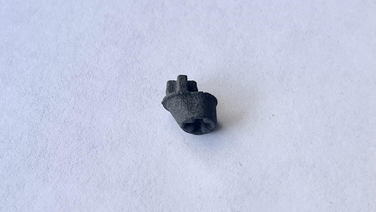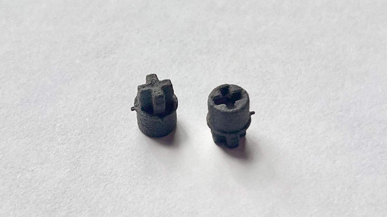 The CAD models are from this github repo. I followed the advice from this guide on breadbox64.com and had them printed in nylon using SLS. Since this process fuses powder, the adapters come clogged (left adapter below). I used a blunt syringe needle to clean out the recesses (right adapter below).