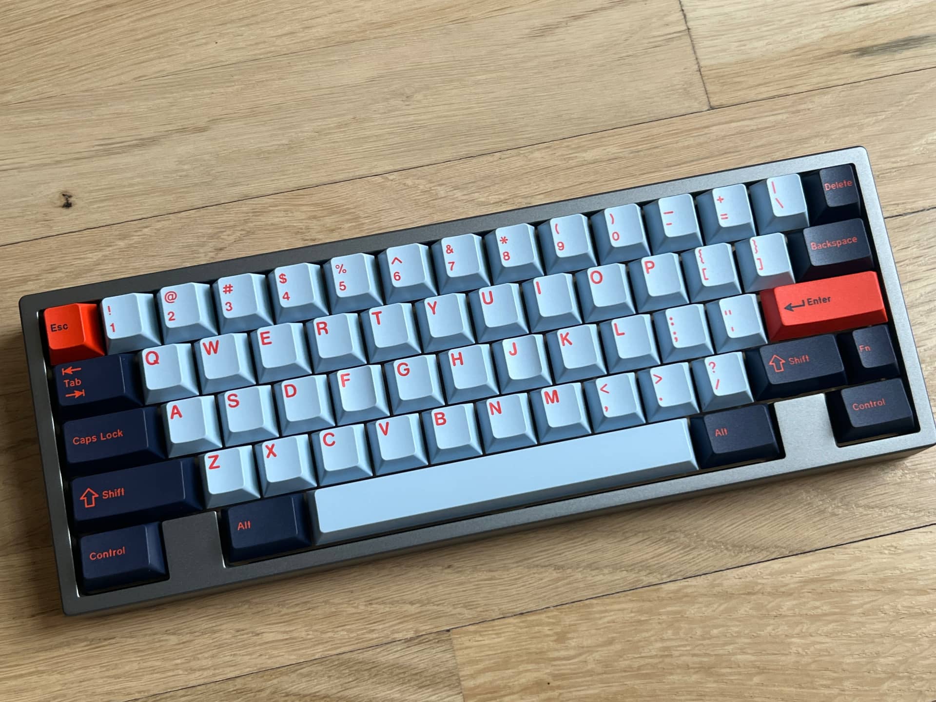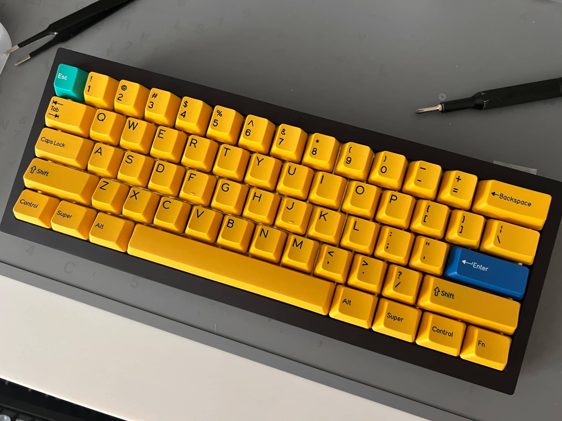 Built with some hand assembled MM switches. Blue top, purple bottom, yellow stems, 62g springs. Brass plate. Very solid but not harsh. Lovely keyboard. The DCS caps keep it pretty poppy on keypress. Sound is exceptional with no hint of ping or hollowness. No mods needed.