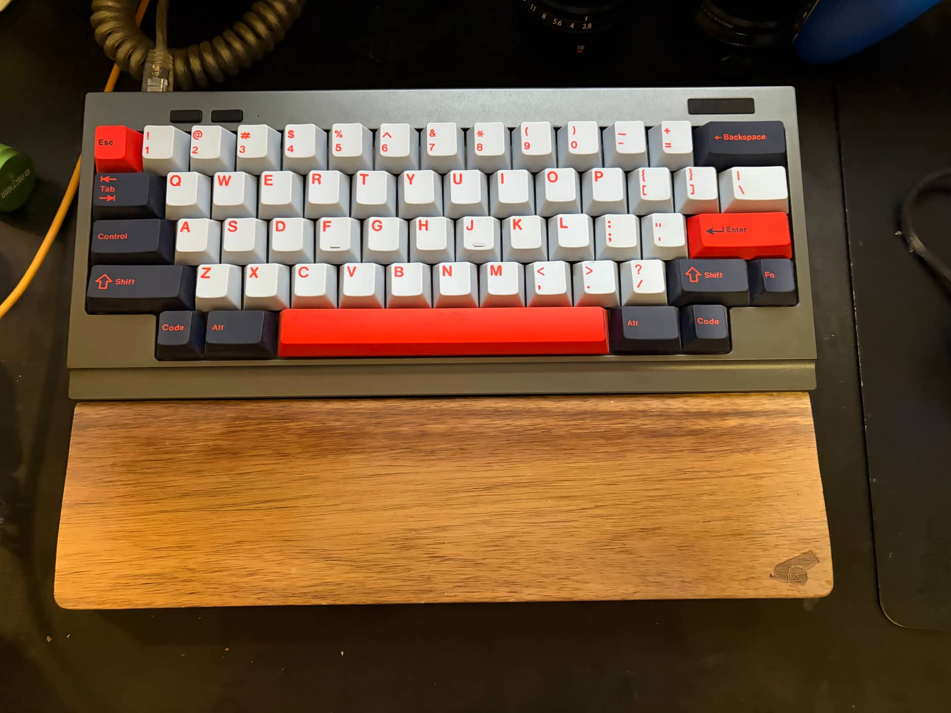 While I had it open I lubed the 2u stabs and slapped in as many steel wheel weights as would fit because who doesn’t want their expensive Topre board to follow the design philosophy of counterfeit Beats headphones? I also threw on the red Esc key the guy from Leaderkeys threw in gratis when I bought the board in Seoul.