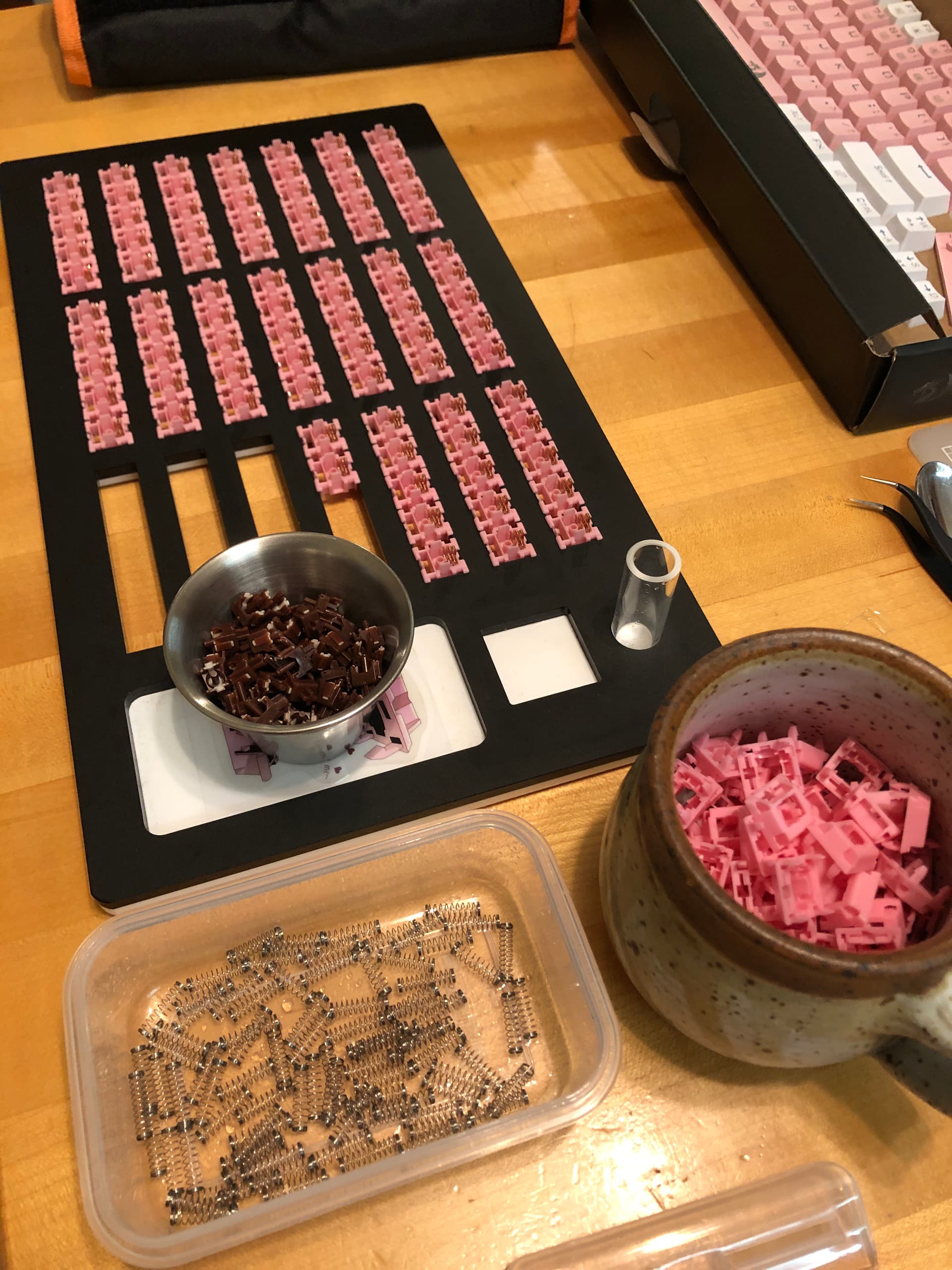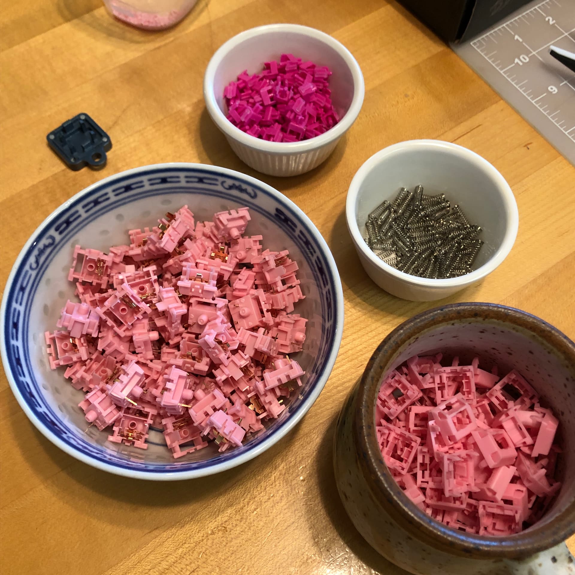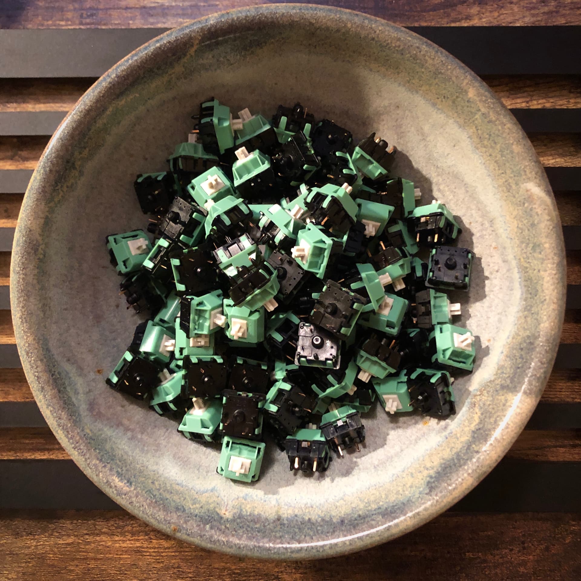 Dessert first; the fruits of today’s labor. (Yours are next, @Den-Fi!) Part of a low-budget build project, these switches are for a friend entering a WFH position who wanted something quiet. From a selection of 9 shushed switches, they chose these, the only frankenswitch on the tester: