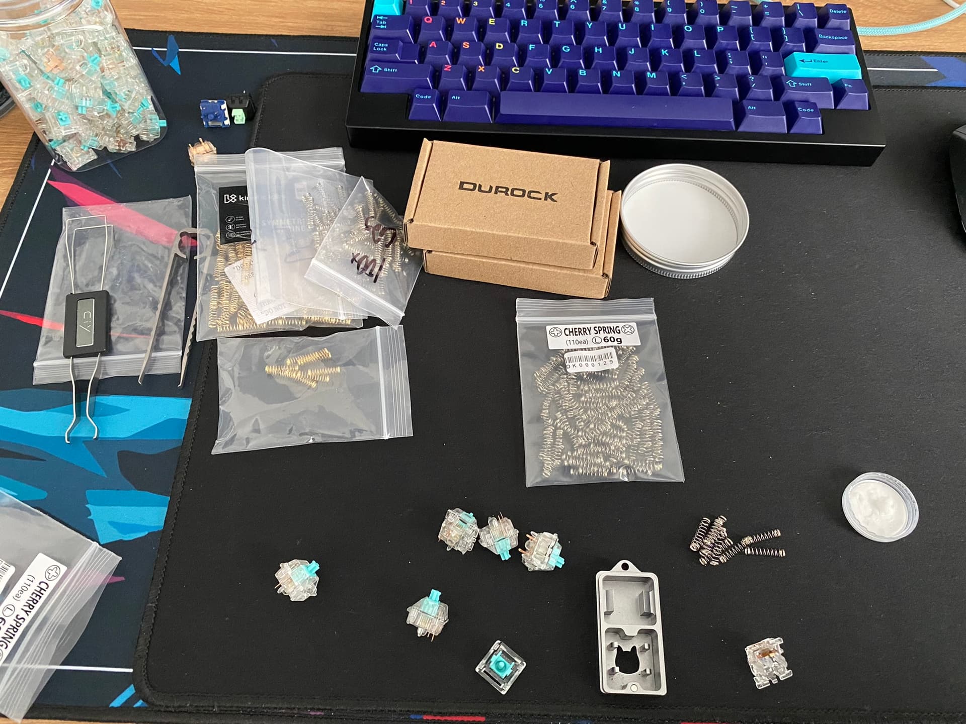 The Tealios are what led to the mess. I found Durock long springs that were shorter than the symmetric springs that were giving me issues and…the same result of coil friction crunch. For whatever reason, Tealios just do not get along with longer springs. Happily, I had success with 60g TX long springs. They’re not my first choice of spring but I’m happy to have something that works. So I wanted to avoid using TX longs and ended up with…different TX longs