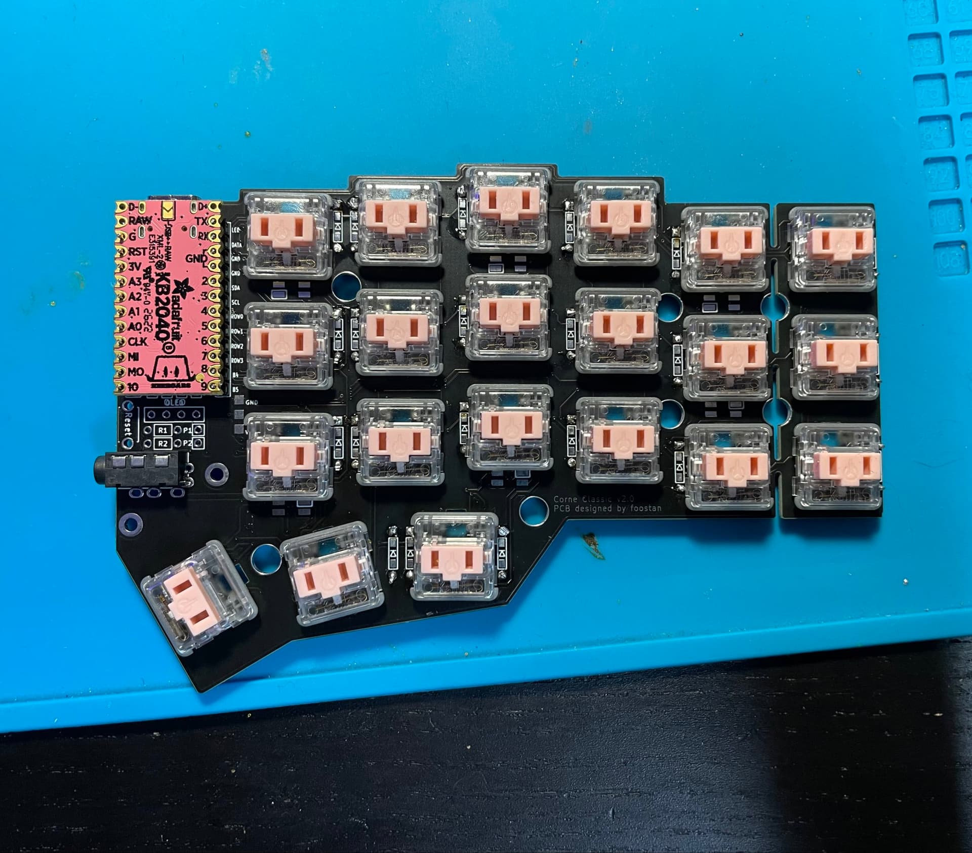 First Corne, Split and LP Build all in one. Kailh Choc Pinks with only lube, tried tape modding and after soldering a few I decided I don’t like it. Good I gone without plate so I could remove the tape again. Just waiting for another MCU to finish this.