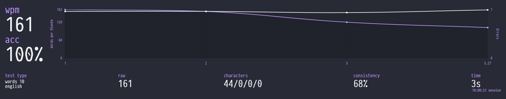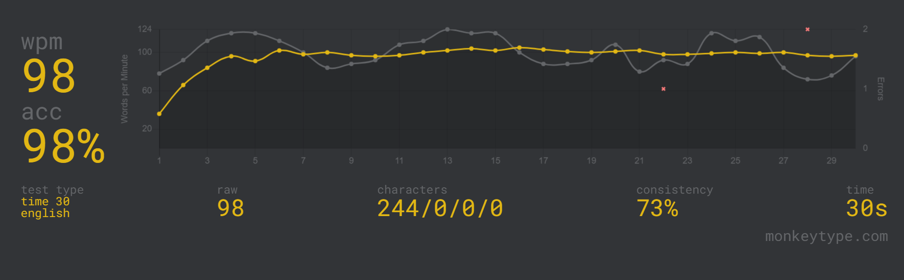 Anywhere from 120-140 WPM depending on the language and length used in Monkeytype, but nowadays I nearly exclusively use English 1K words because I’m bored of English which has too little variety. I can burst up to 145ish wpm at 25 words/15s. (I actually just did this one while writing this comment for fun)