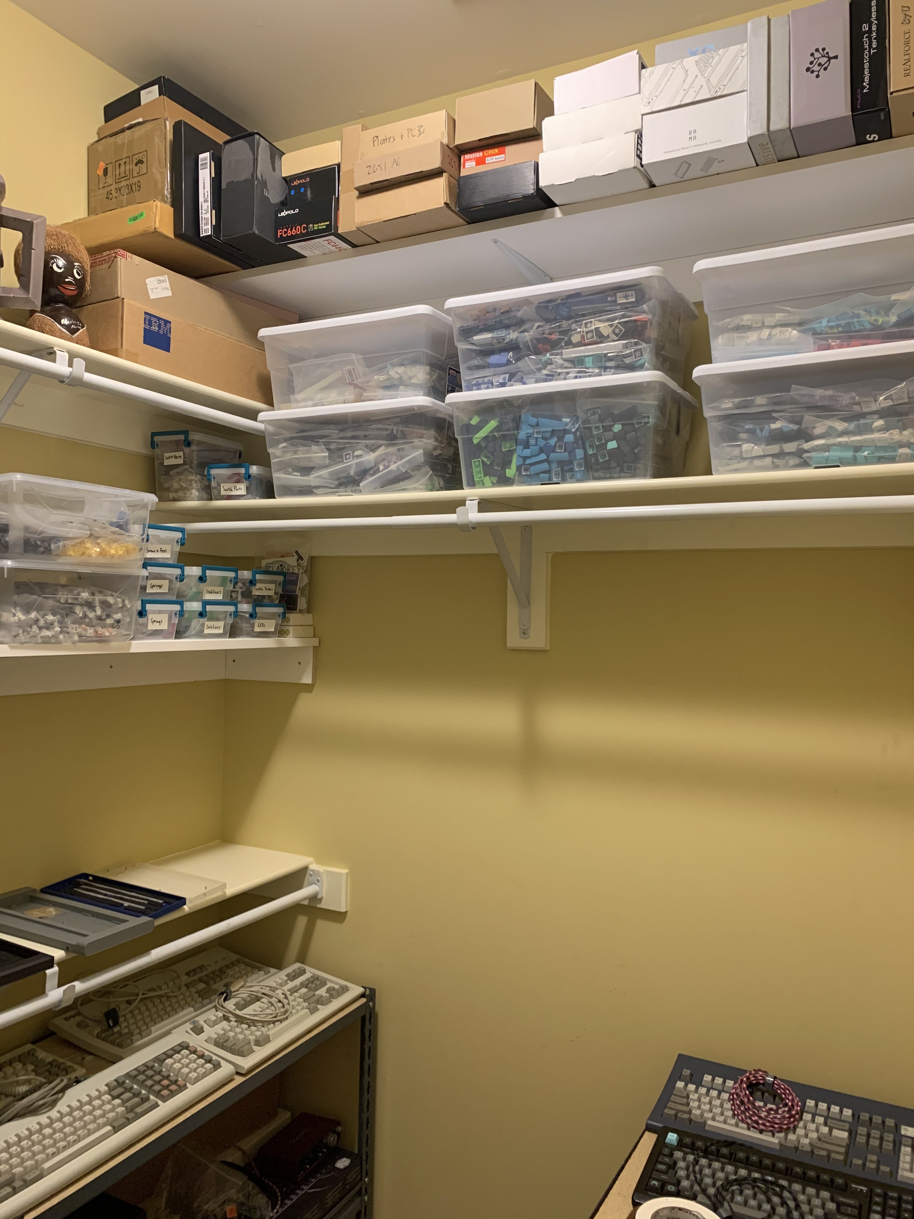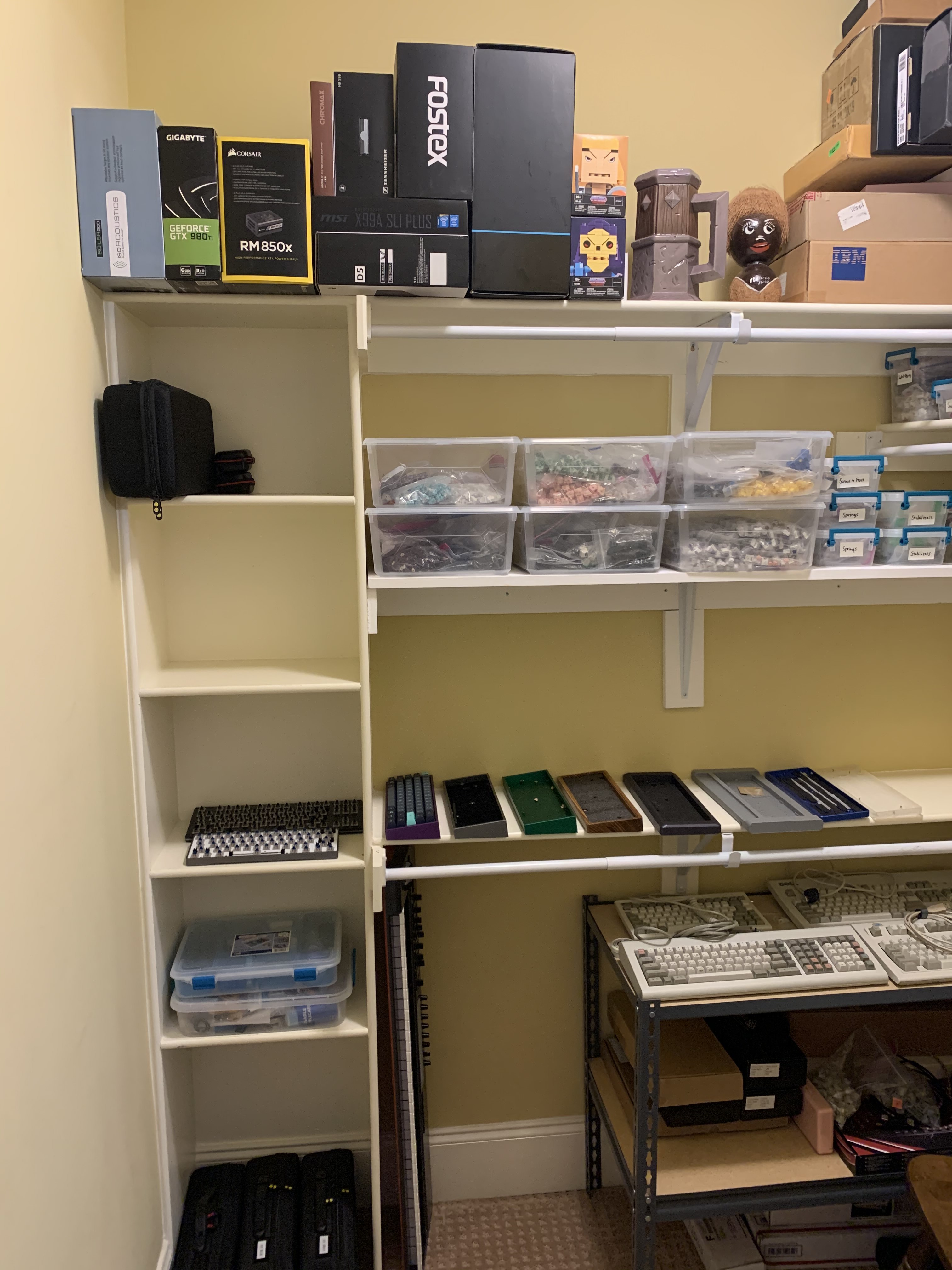 Works for me since the closet is now completely full. Not much room for storage in this space. Still looking for an affordable solution for good-looking open storage. I find myself needing to get to keycaps and switches much more often than keyboards. Unfortunately they don’t look as pretty sitting around